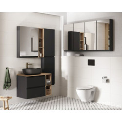 Pojemny słupek na przechowywanie akcesoriów łazienkowych wykończony został lakierem w kolorze antracyt. Posiada wygodne frezowane uchwyty. Na wewnętrznej stronie drzwi zamontowane zostało duże, pionowe lustro. Dla komfortu użytkowania drzwi słupka mają zawiasy 165 stopni, które umożliwiają szerokie ich otwieranie. Wyposażone są również w system cichego domykania.