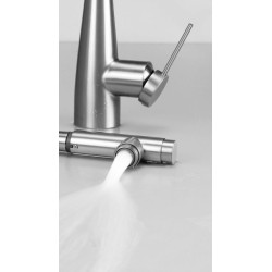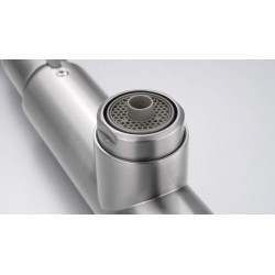 Funkcjonalna bateria kuchenna zaprojektowana została z myślą o wysokiej użyteczności oraz estetycznym wyglądzie. Elegancki design sprawia, że pasuje do wnętrz nowoczesnych, ale też skandynawskich czy bardziej tradycyjnych. Bateria zlewozmywakowa posiada aerator, który redukuje życie wody, co przy ręcznym myciu naczyń jest bardzo istotne. Dodatkowo napowietrzony strumień jest bardziej miękki. To model z podłączeniem do filtra wody. Dodatkowo wylewkę można wyciągnąć na długim i elastycznym przewodzie, co ułatwia spłukiwanie dużych i niewymiarowych elementów np. blachy z piekarnika lub półki z lodówki.