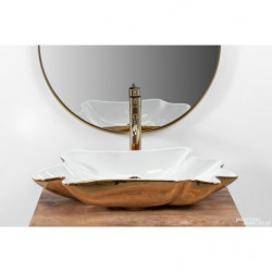 Umywalka wykonana z najwyższej jakości ceramiki w białym kolorze i owalnym, pofalowanym kształcie. Umywalka wykończona złotym rantem, co nadaje piękny efekt końcowy. Umywalka jest niesamowicie atrakcyjna dla oka, jest idealna dla miłośników niestandardowych kształtów, wnosząc elegancję do aranżacji łazienki w domu i biurze.